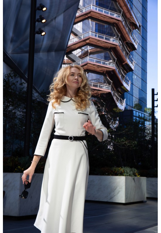 Это белое платье миди — воплощение утончённости и безупречного вкуса. Сшито из премиальной костюмной ткани, имеет мягкий А-силуэт и контрастную чёрную отделку по воротнику, манжетам и карманам. Линии отделки подчёркивают элегантность кроя, а бархатный пояс с жемчужной пряжкой акцентирует талию. Универсальное и элегантное, оно идеально подойдёт для дневных встреч и вечерних выходов.