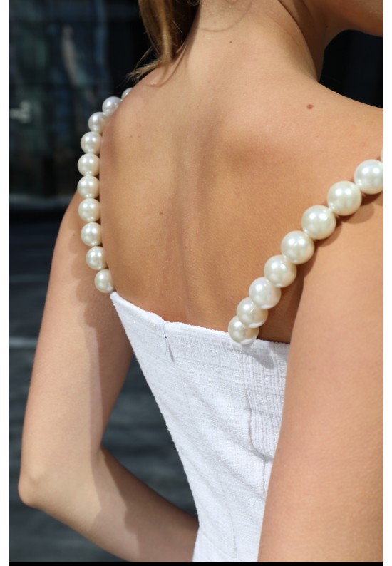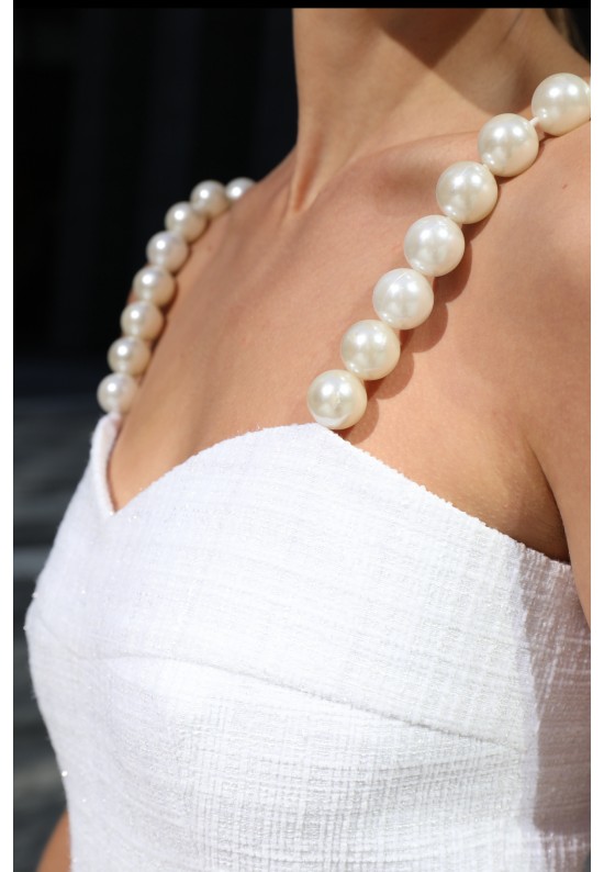 Этот белый твидовый сарафан — воплощение изысканной женственности и современной легкости. Выполненный из премиального хлопково-шёлкового твида, он имеет приталенный лиф и А-силуэт юбки, создающий элегантную линию фигуры. Акцентные бретели, декорированные крупным жемчугом, придают образу аристократичную утонченность. Декоративные карманы с жемчужными пуговицами добавляют современного характера.
