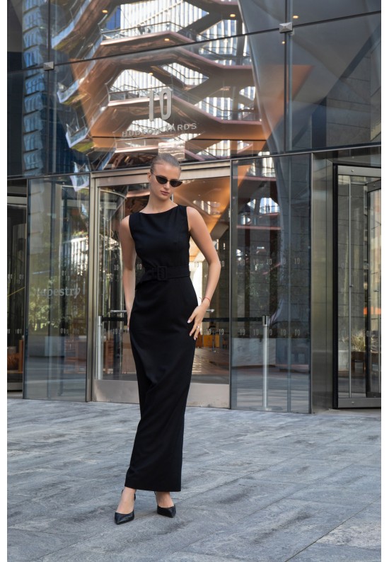 Это чёрное платье макси — воплощение минимализма и вечной элегантности. Сшито из премиальной костюмной ткани на основе хлопка и вискозы, оно идеально держит форму и подчёркивает силуэт. Безрукавный крой открывает плечи, а пояс с обтянутой пряжкой создаёт акцент на талии. Универсальная модель — для деловых встреч и вечерних выходов.