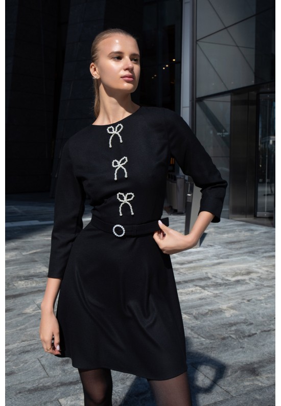 Это чёрное платье — воплощение классической элегантности с современными акцентами. Сшито из премиальной ткани, имеет приталенный силуэт с мягким расклёшенным низом и акцентным поясом с декоративной жемчужной пряжкой. Главная деталь — ручная вышивка в виде трёх жемчужных бантиков на лифе, которые создают утончённый акцент. Рукава ¾ делают платье универсальным для дневных мероприятий и вечерних выходов.