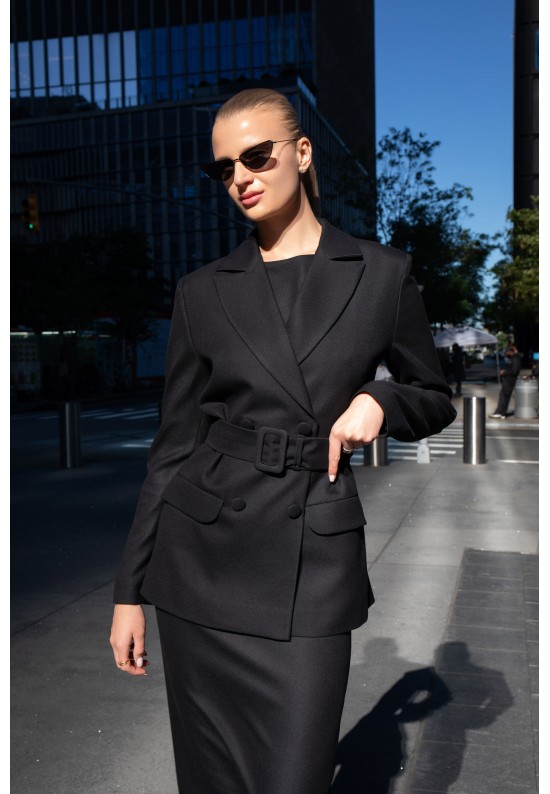 Этот жакет — воплощение современной элегантности и уверенности. Сшит из премиальной костюмной ткани, имеет чёткий силуэт, акцент на талии и пояс с обтянутой тканью пряжкой. Классические лацканы и накладные карманы придают структуру, а женственный крой подчёркивает фигуру.